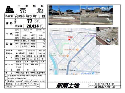 | 備考 | 一方通行規制あり(博労本町清水町一丁目線) 相続登記後の引渡し コンパクトな土地ゆえに、それを生かした土地活用が可能です 駐車場、小規模アパート、オフィス、トランクルームなど ■価格改定 88万円→77万円(令和8年1月30日) |